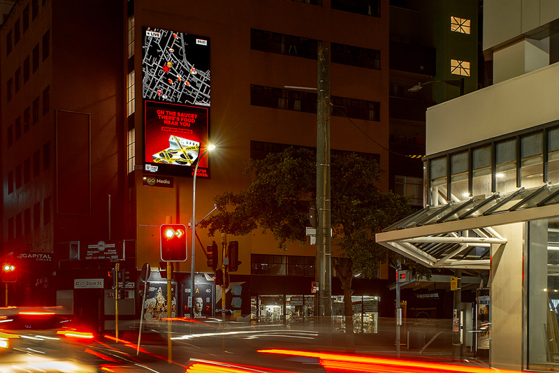 The creative runs across Go Media’s national digital out of home network. A custom-built API by Latch updates the live map throughout the night, showing quick service restaurants open within an 800m radius of each screen.