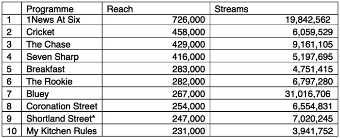 Five of the top 10 streaming shows were local, with 1News at Six retaining its number one spot.